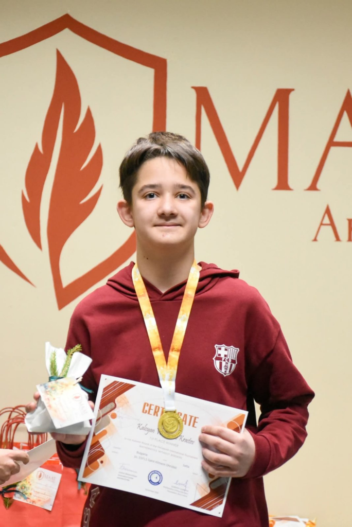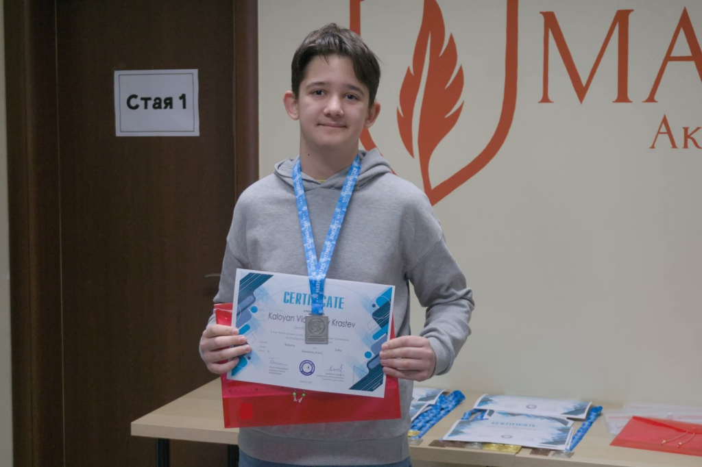 На международния турнир „Математика без граница“, който се състои от три кръга есен, зима и пролет. Ученикът от 5 Е клас на 32 СУИЧЕ Калоян Кръстев грабна 1-во място за есен и 2-ро място за зима. Предстои още един кръг, а след това и заключителни състезания. Гордеем се с Калоян и му пожелаваме успех в следващия етап!